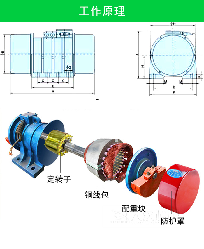 振動電機的結構由兩部分組成:一是專門設計的驅動三相異步電動機或單相電動機部分,其原理與普通電機一樣,另一部分是具有偏心質量,并可調節偏心距的激振機械部分。